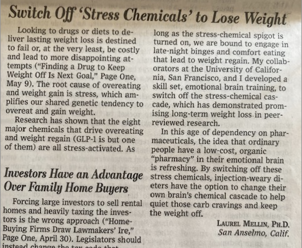 As all eight of the major chemicals that fuel overeating and weight gain are stress-activated, by using EBT to switch off the "stress chemical spigot," we stand our best chance for easy, lasting weight loss that is drug-light or even drug-free. There are only positive side-effects, and each use of EBT reshapes the emotional architecture of the brain in favor of lasting weight loss and a life of joy and purpose. That sounds like a solution to me. So, I dashed off a letter to the editor, which appeared in the journal last week.